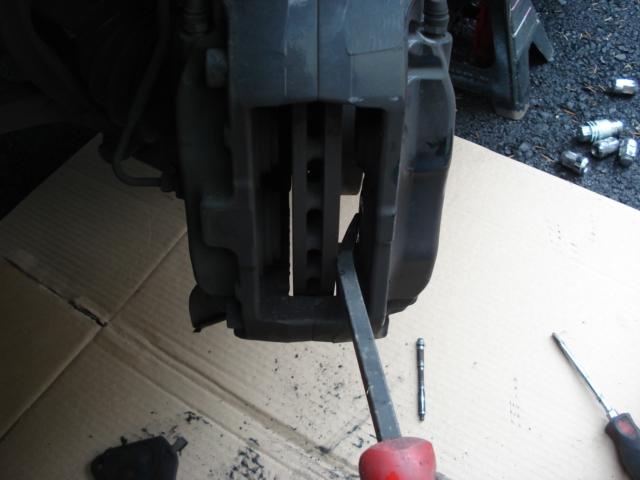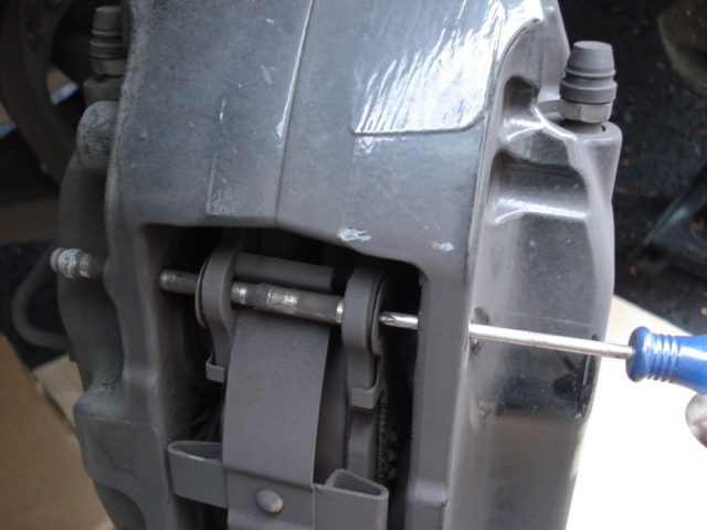 First jack up the front of the car and place it on jack stands. If you have them OEM wheel locks, you'll find the wheel lock key in the spare tire compartment in the trunk, under the carpet. Then, using a small screwdriver or punch and a hammer, knock out the brake pad retaining pins in the caliper and remove them completely. Take note of which way they face, they need to go back into the caliper in the same direction. |