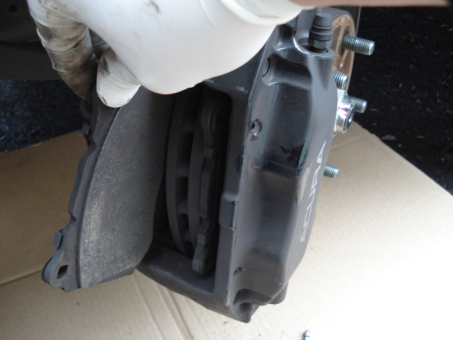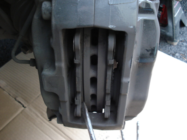 Once they old pads are removed, you will need to push the brake pistons back into the caliper until they are flush, otherwise the new pads (since they are thicker) will not fit into the caliper. You can use a pry bar or long flat head screw driver and gently push on the edge of the pistons. You may need to hold the other pistons by hand so they do not come back out when you push on the remaining ones. Once the pistons are pushed into the caliper, take note of the new pads as there is an inner and and outer pad. The outer pad has the squeel tab on it to warn you when the pad needs replacement. |