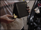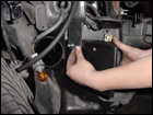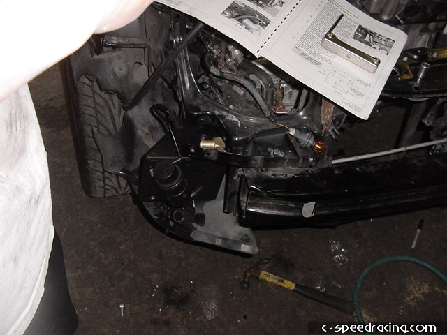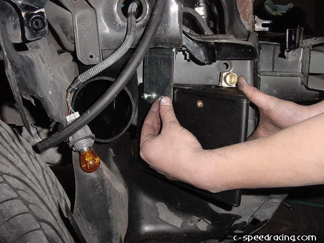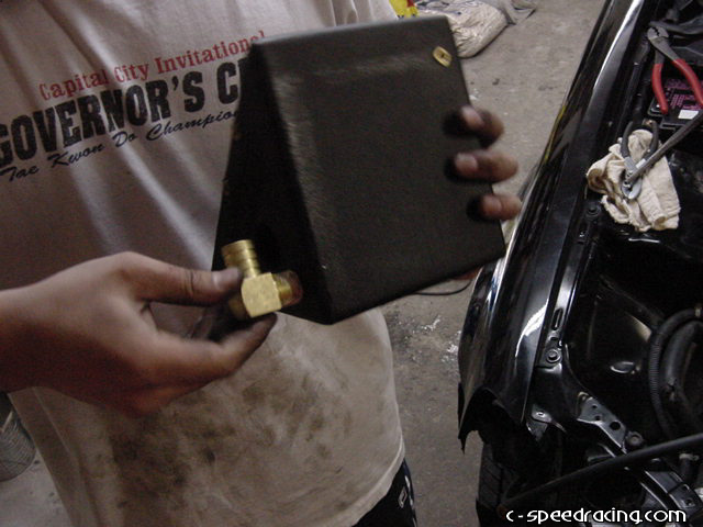 Now you can mount the water box in the passengerside fender well. Using the supplied mounting bracket, drill mounting holes into the sheet metal where the headlight goes. Then using sealer, attach the 90deg fittings to the water box as indicated on the top and bottom of the box. |