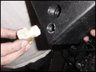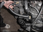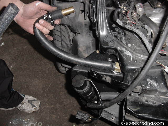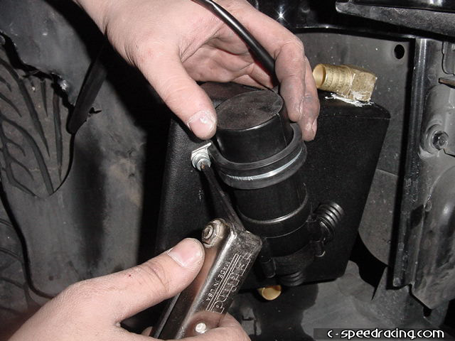 Then using the supplied straight and 90deg hoses, attach the water cooler to the box and the water pump. Then run the 90deg hose from the box to passengerside fender and feed it through the existing hole. |