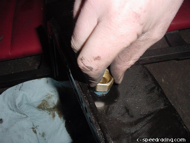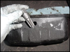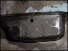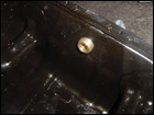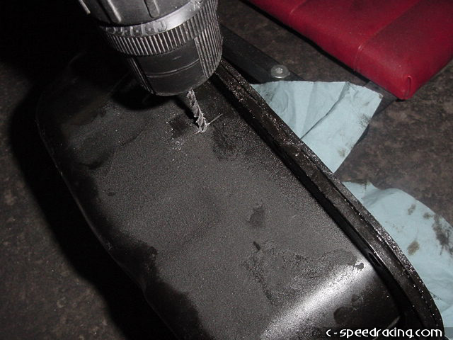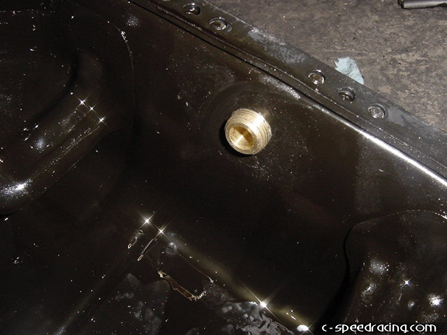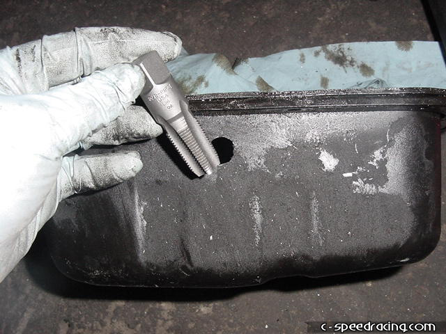 Adequately cover the inside of the oil pan in order to collect and metal shavings and begin drilling with a small drill bit and work your way up to the correct size. The hole needs to be 7/16" in order to use a 3/8" tap for the fitting. |