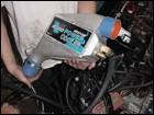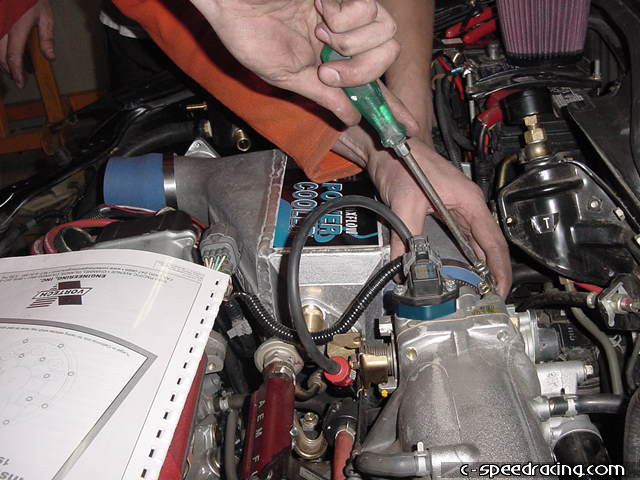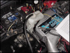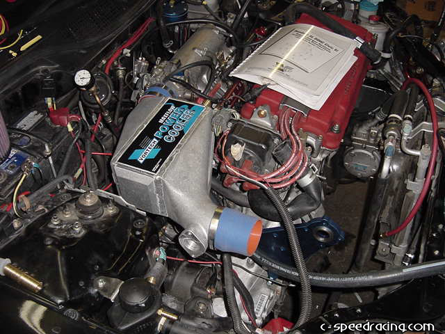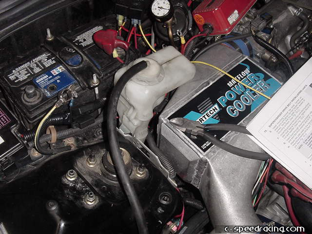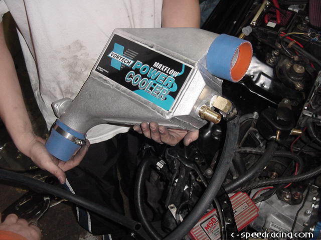 Now you can finally mount the aftercooler. Before dropping it in place, be sure that all the fittings are correctly mounted on the aftercooler and attach the water lines and silicone hoses. Fairly easily, the aftercooler will slip into place in the engine bay and using the supplied clamps, clamp the silcone hoses down. |