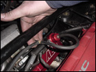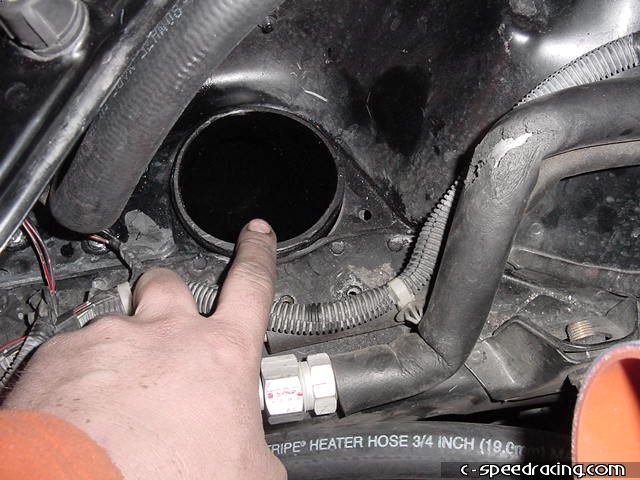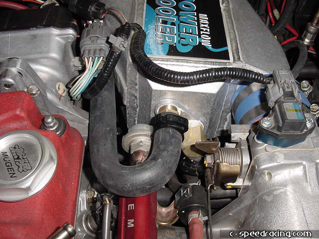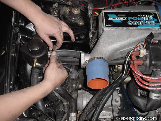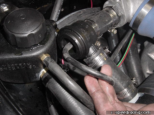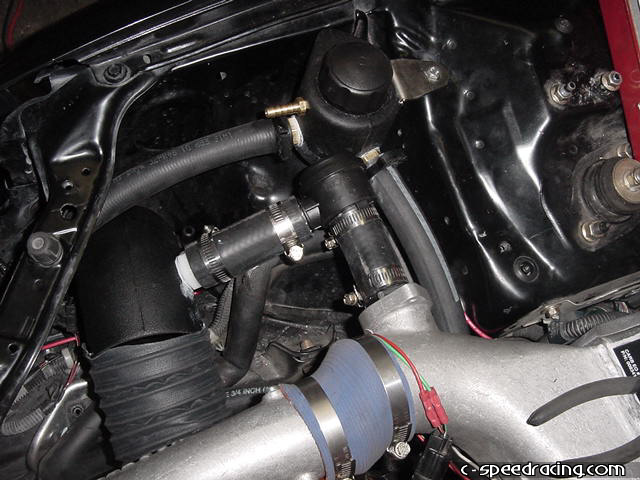 Now finish off the blow off valve by routing the outlet back into the intake pipe. Then run a hose from the new water overflow bottle location to the watercooler resevoir. |