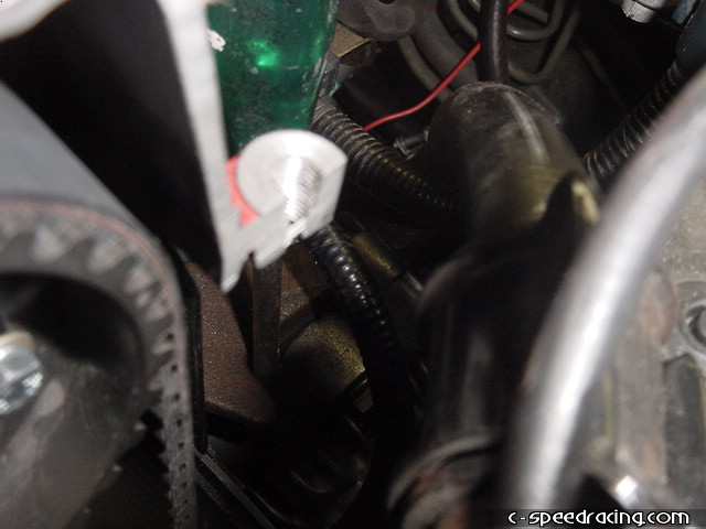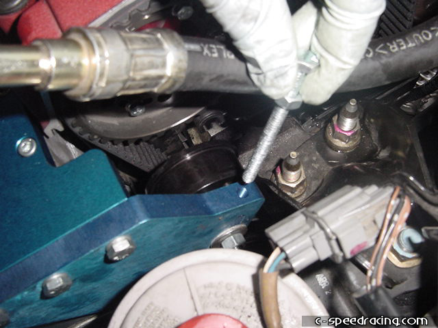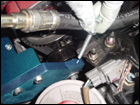 You're almost done now. You can go ahead and reinstall the alternator belt and using a slot head screw driver, insert it between the bracket and alternator and pry the alternator over to tention the belt. Simultaneously, tighten the upper and lower bolts on the alternator to hold it in place. Then you can run the new longer supercharger belt. Be sure the route it correctly. Then tention the new belt by turn the tentioner bolt on the main bracket. |
